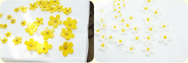 *Pentru copacei am decupat o coroana in forma de floare din pasta de zahar verde si le-am fixat pe o frigaruie.Trunchiul l-am rasucut si l-am facut din pasta de zahar maro.